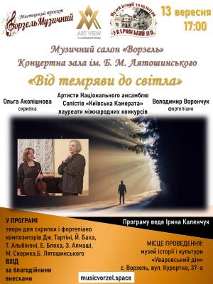Артисти Національного Ансамблю Солістів "Київська Камерата"лауреати міжнародних конкурсівОльга Аколішнова (скрипка)Володимир Ворончук (фортепіано)У програмі:Дж. Тартіні Соната для скрипки та фортепіано "Трелі диявола" Й. Бах Хорал з ораторії "Ст…