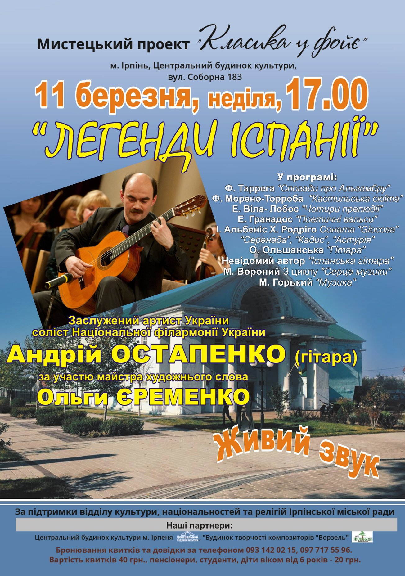 "Класика у фойє" запрошує: 11 березня, неділя, 17.00 - концерт гітарної музики "Легенди Іспанії" заслуженого артиста України, соліста Національної філармонії України Андрія ОСТАПЕНКА (гітара) за участю майстра художнього слова Ольги ЄРЕМЕНКО. У програмі: Ф.Таррега "Спогади про Альгамбру" , Ф. Морено-Торроба "Кастильська сюїта" , Е. Віла- Лобос "Чотири прелюдії", Х. Родріго Соната "Giocosa", Е.Гранадос "Поетичні вальси", І. Альбеніс "Серенада", "Кадис", "Астурія". Виконує А.Остапенко. О.Ольшанська "Гітара", невідомий автор "Іспанська гітара" М. Вороний З циклу " Серце музики", М. Горький "Музика" Виконує Ольга Єременко.