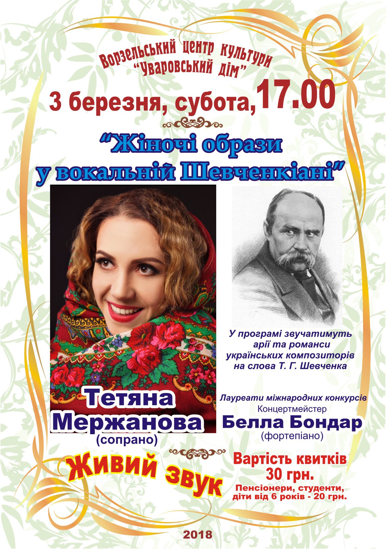 Музичний салон "Уваровського дому" запрошує: 3 березня, субота, 17.00 - концерт "Жіночі образи у вокальній Шевченкіані".