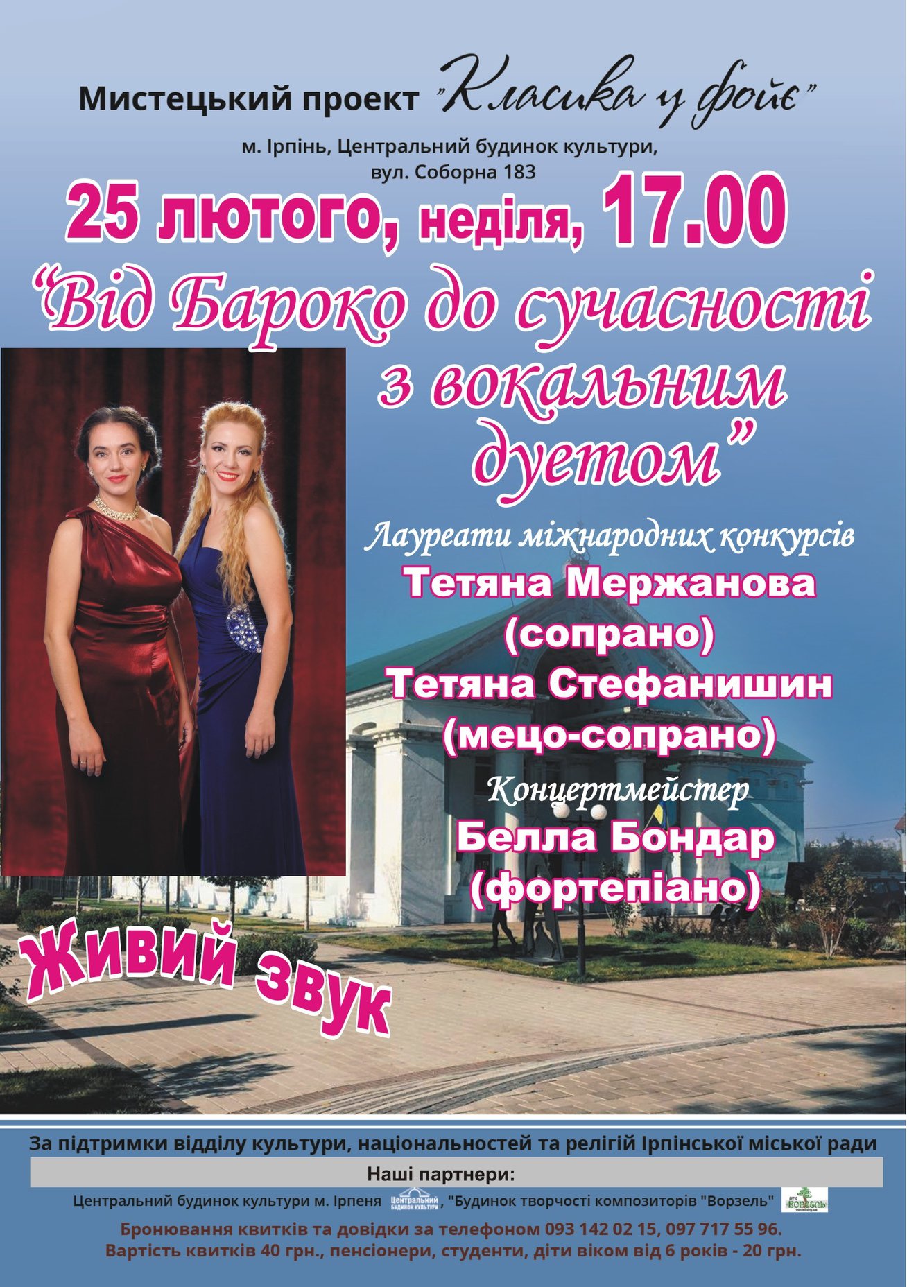 "Класика у фойє" запрошує: 25 лютого, неділя, о 17.00 - вечір вокальних дуетів "Від Бароко до сучасності" за участю лауреатів міжнародних конкурсів Тетяни МЕРЖАНОВОЇ (сопрано), Тетяни СТЕФАНИШИН (мецо-сопрано), концертмейстер Белла БОНДАР (фортепіано). У програмі: А. Вівальді. Дует «Laudamus te» з «Gloria»