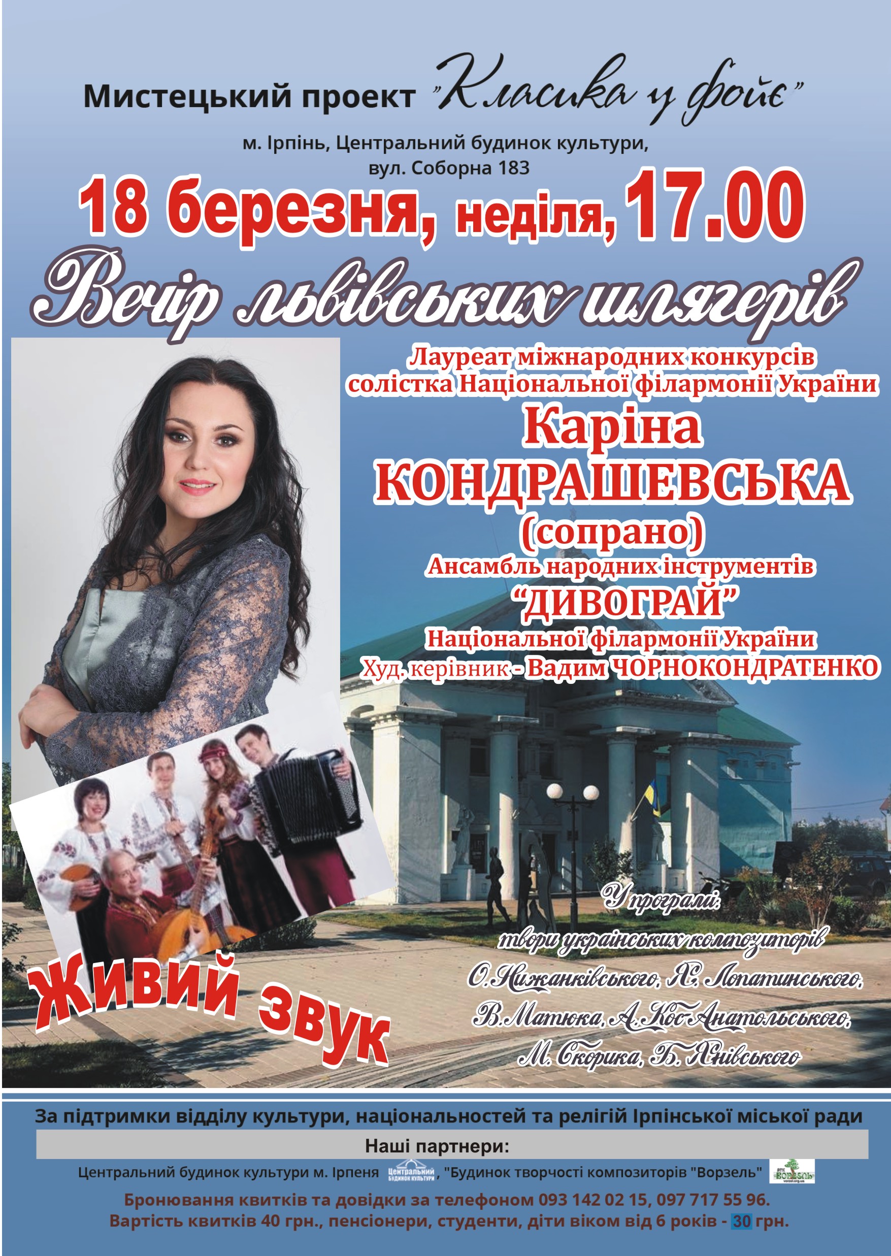Запрошуємо вас на унікальну програму сольного концерту "Вечір львських шлягерів" солістки Національної філармонії України, лауреата міжнародних конкурсів Каріни КОНДРАШЕВСЬКОЇ (сопрано) під супровід ансамблю народних інструментів "ДИВОГРАЙ" Національної філармонії України під керівництвом заслуженого артиста України Вадима ЧОРНОКОНДРАТЕНКА.