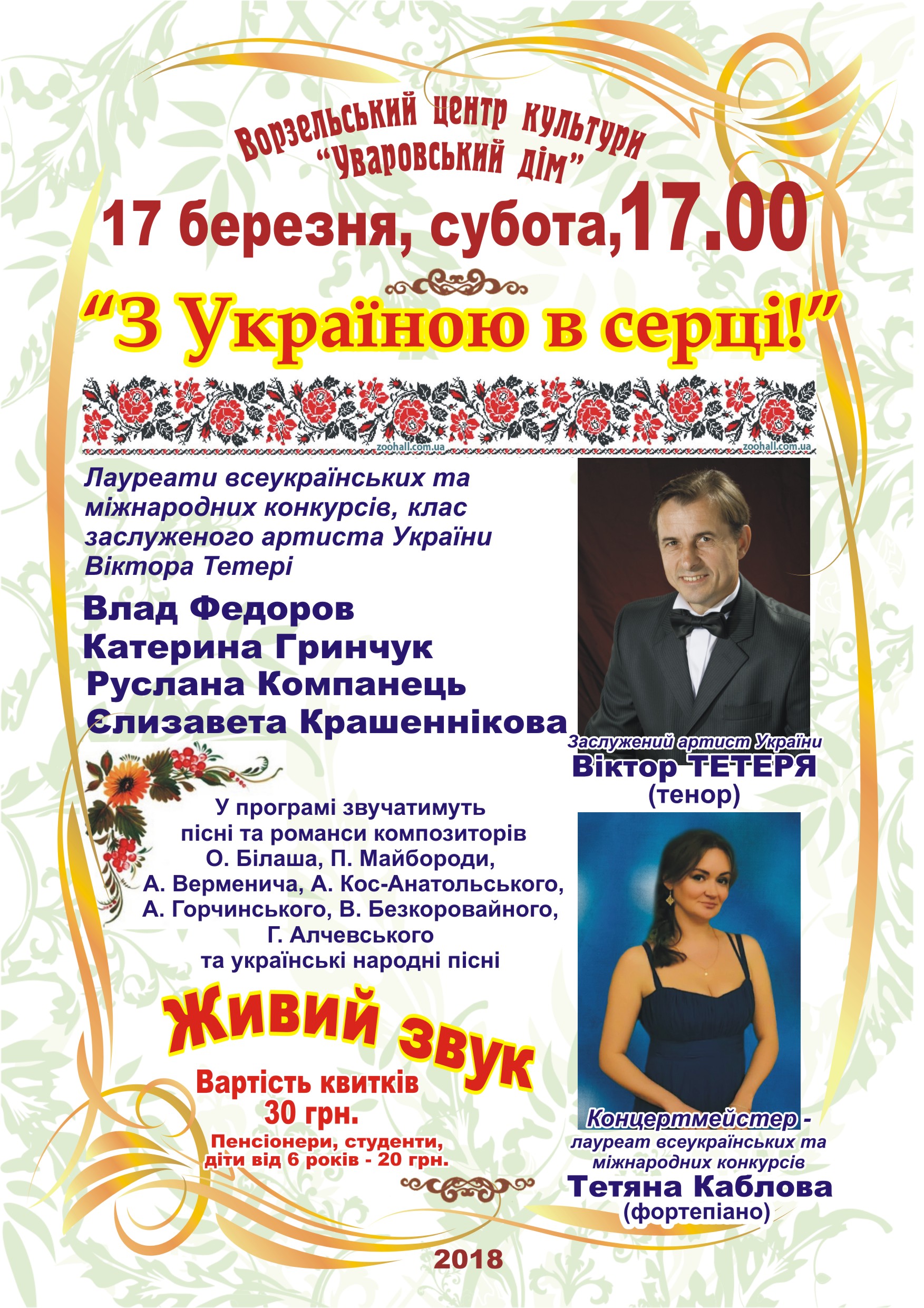 "З Україною в серці!" - так називається концертна програма, яка відбудеться 17 березня, у суботу, о 17.00 в музичному салоні "Уваровського дому".