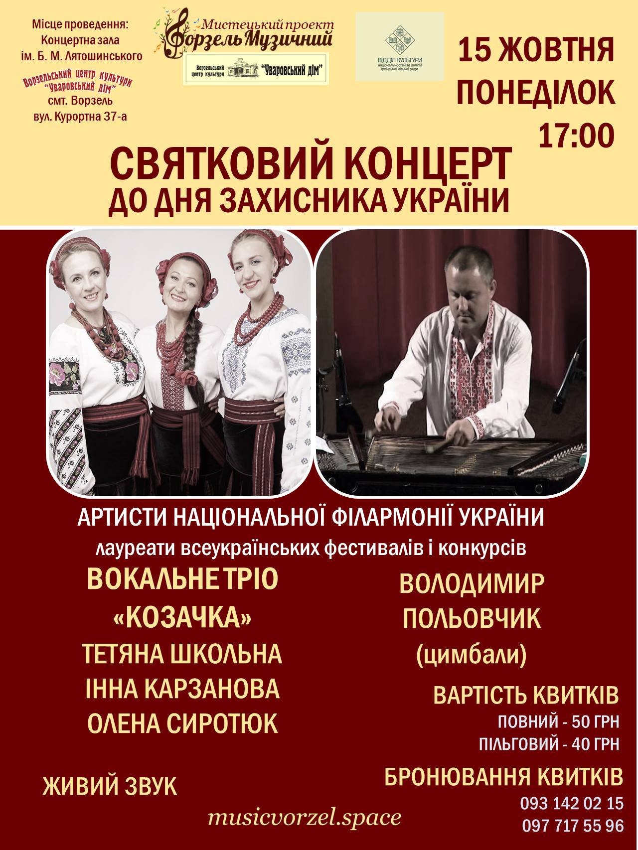 Вартість квитків: повний 50 грн., пільговий - 40 грн.
